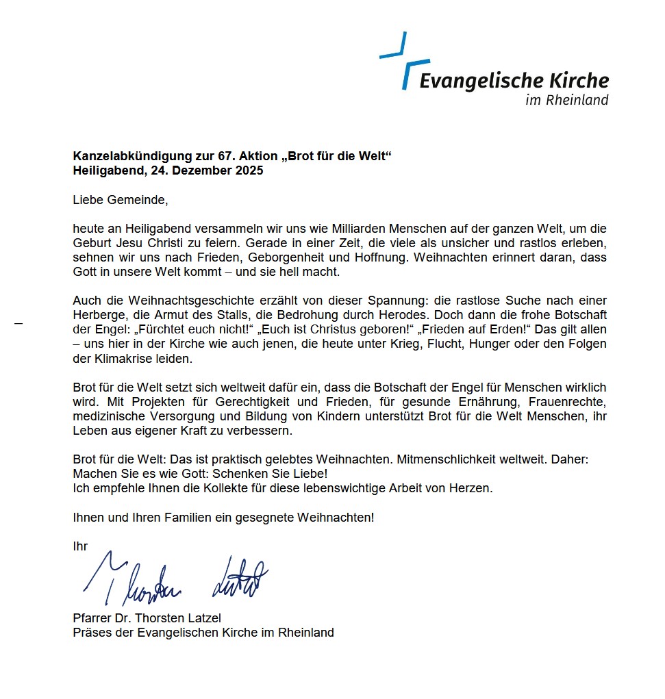 Umso mehr sehen wir uns in der Pflicht, den Zusammenhang von Gerechtigkeit, Frieden und Bewahrung der Schöpfung ernst zu nehmen und uns für den Erhalt natürlicher Lebensgrundlagen, gegen Hunger und für gerechte Strukturen in der Welt einzusetzen.